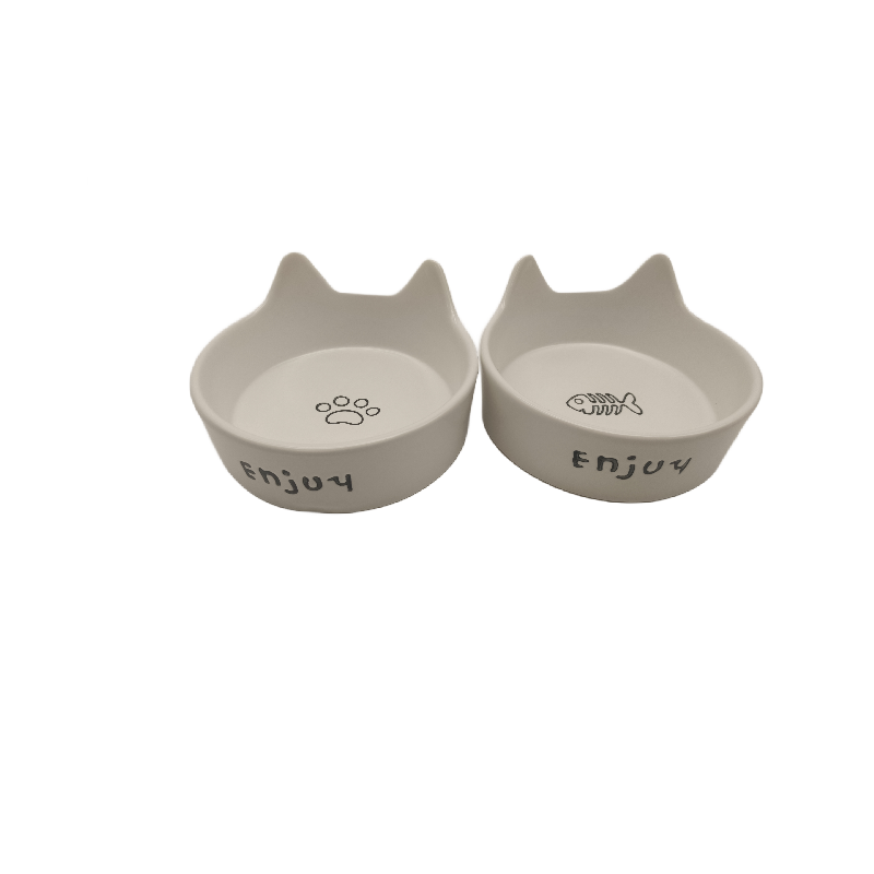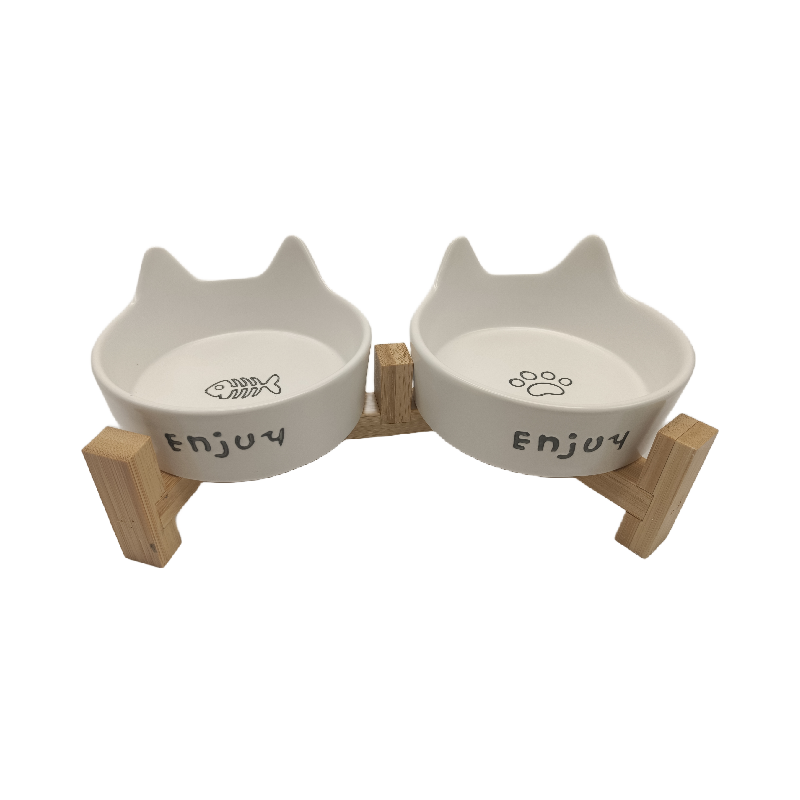 Cat Ear-Shaped Creamy White Ceramic Double Bowl + Upgraded Tall Wooden Frame